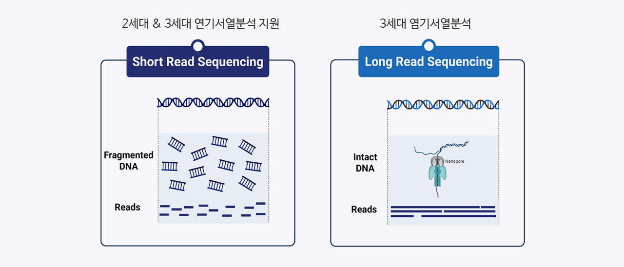 분석종류 3세대(Nanonpore) 시퀀싱 장점 DNA 반복서열(repeat), 구조변이(SV), 복잡한 유전체 영역 분석 가능 조립(assembly)이 용이해 de novo 분석에 유리 후생유전학적(methylation) 변형 동시 분석가능 PCR-free 분석 가능 RNA Full-length 전사체 분석 (isoform 단위 분석 가능) Alternative splicing 분석 Direct RNA 시퀀싱 -> post-transcriptional 변형 분석 가능(m6A)