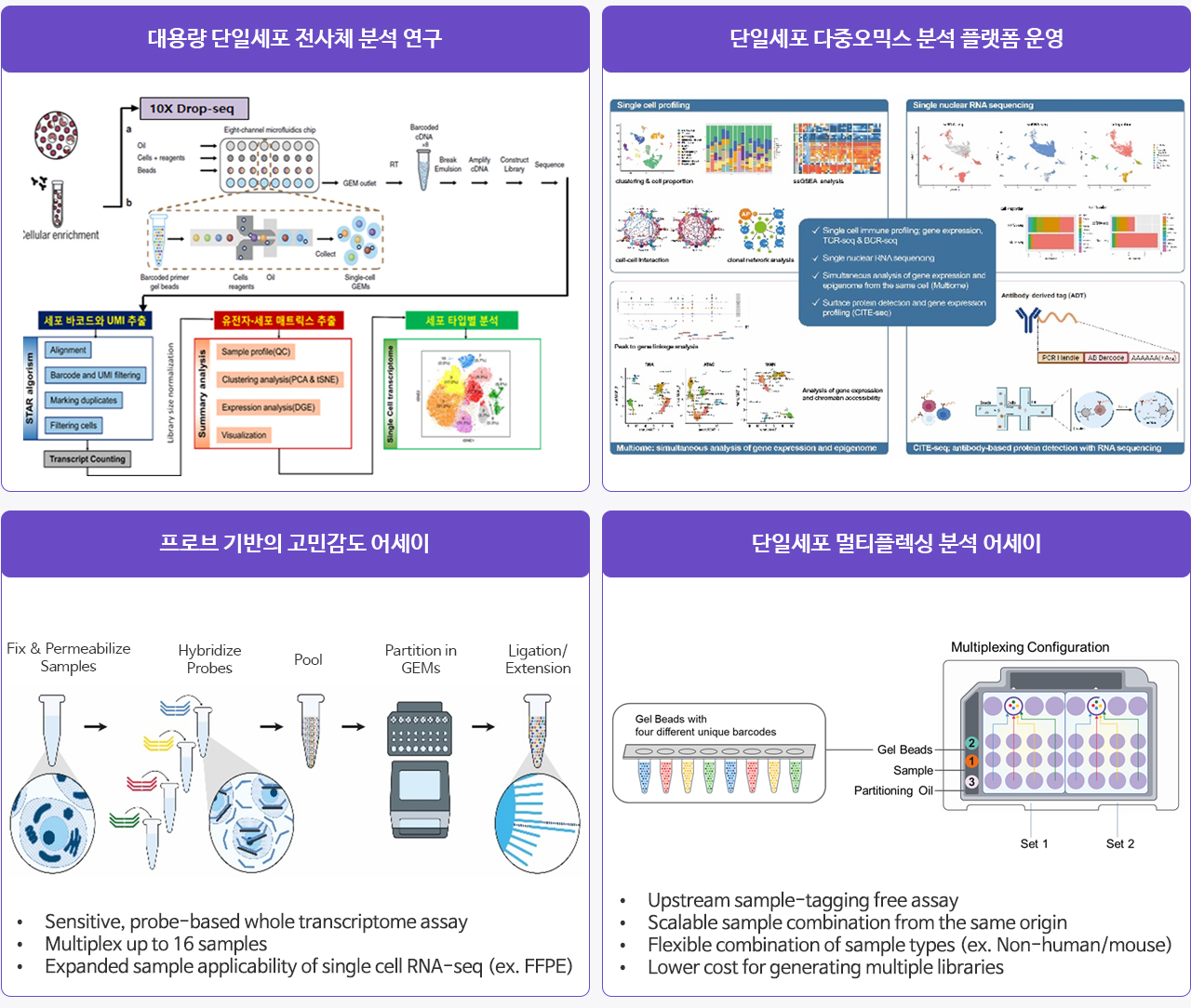 - 단일세포 오믹스 분석 플랫폼 운영: 대용량 단일세포 전사체 분석 시스템을 활용하여 다양한 질환의 단일세포 수준에서 분석