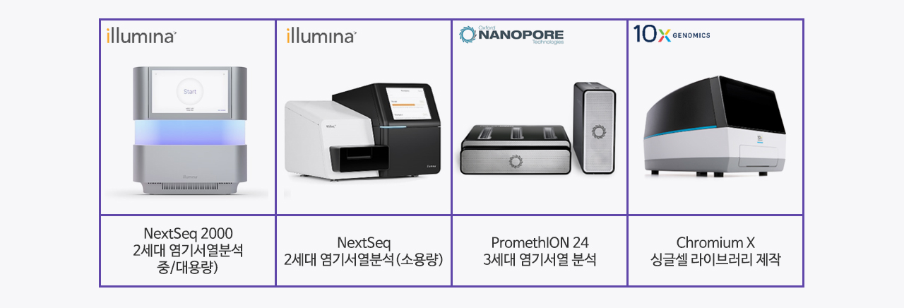 염기서열분석기기 지원 항목 시약 및 참고사항 Illumina(NextSeq2000,Miseq) WES (Whole Exome Sequencing) Agilent Technologies, Twist Bioscience WTS (Whole Transcriptome sequencing) Illumina (Truseq , Access) CancerSCAN Targeted seq (암질환관련 377개 유전자) CHIP(Clonal hematopoiesis of indeterminate potential) Seq Targeted seq (CHIP관련 168개 유전자) Bulk TCR (T cell receptor)_RNA seq Takara Bio Single cell 10x Genomics_ Expression/TCR/BCR Oxford Nanopore(PromethION 24) WGS (Whole Genome Sequencing) SVs, Methylation (5mC, 5hmC, 6mA) WTS (Whole Transcriptome Sequenicing) Isoform, Splicing, Fusion Direct RNA Isoform, Splicing, Fusion, Methylation (6mA) Single cell Isoform, Splicing, Fusion - 주요 장비