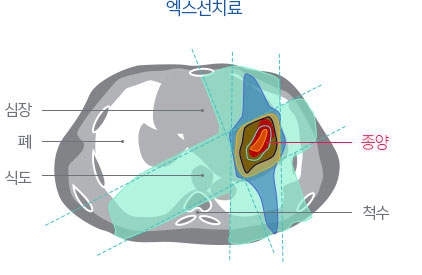 진행성 폐암에서는 수술 대신에 방사선 및 항암치료를 통해 암조직을 치료합니다. 이때 엑스선치료는 폐, 식도, 심장, 척수 등 주변의 정상 장기에 어느 정도 이상의 방사선량이 전달되는 경우가 대부분이나, 양성자치료는 정상 장기에 전달되는 방사선량을 최소화해 부작용이 적은 치료가 가능합니다.