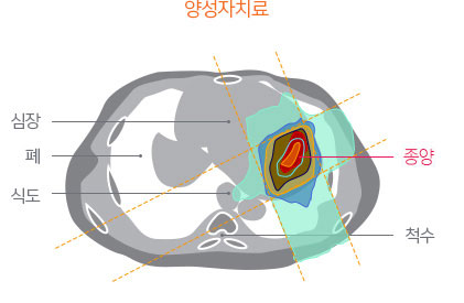 - 치료 범위가 넓어지는 경우, 그만큼 방사선에 노출되는 폐의 범위가 늘어나게 되고 식도, 척수, 심장 등의 정상 장기에 전달되는 방사선량도 많아지게 됩니다. 그에 비해 양성자치료는 암조직에 충분한 방사선량을 주면서도 정상 장기에 전달되는 방사선량은 최소한의 범위로 제한할 수 있어 폐에 미치는 영향을 최소화할 수 있습니다.