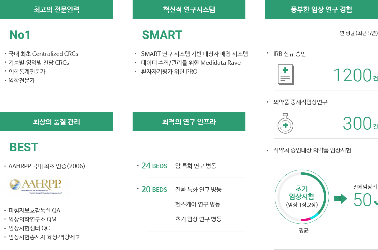 - 미션: 최적의 연구환경을 제공하고 전문인력을 양성하여 혁신적인 환자 치료에 기여하는 임상연구를