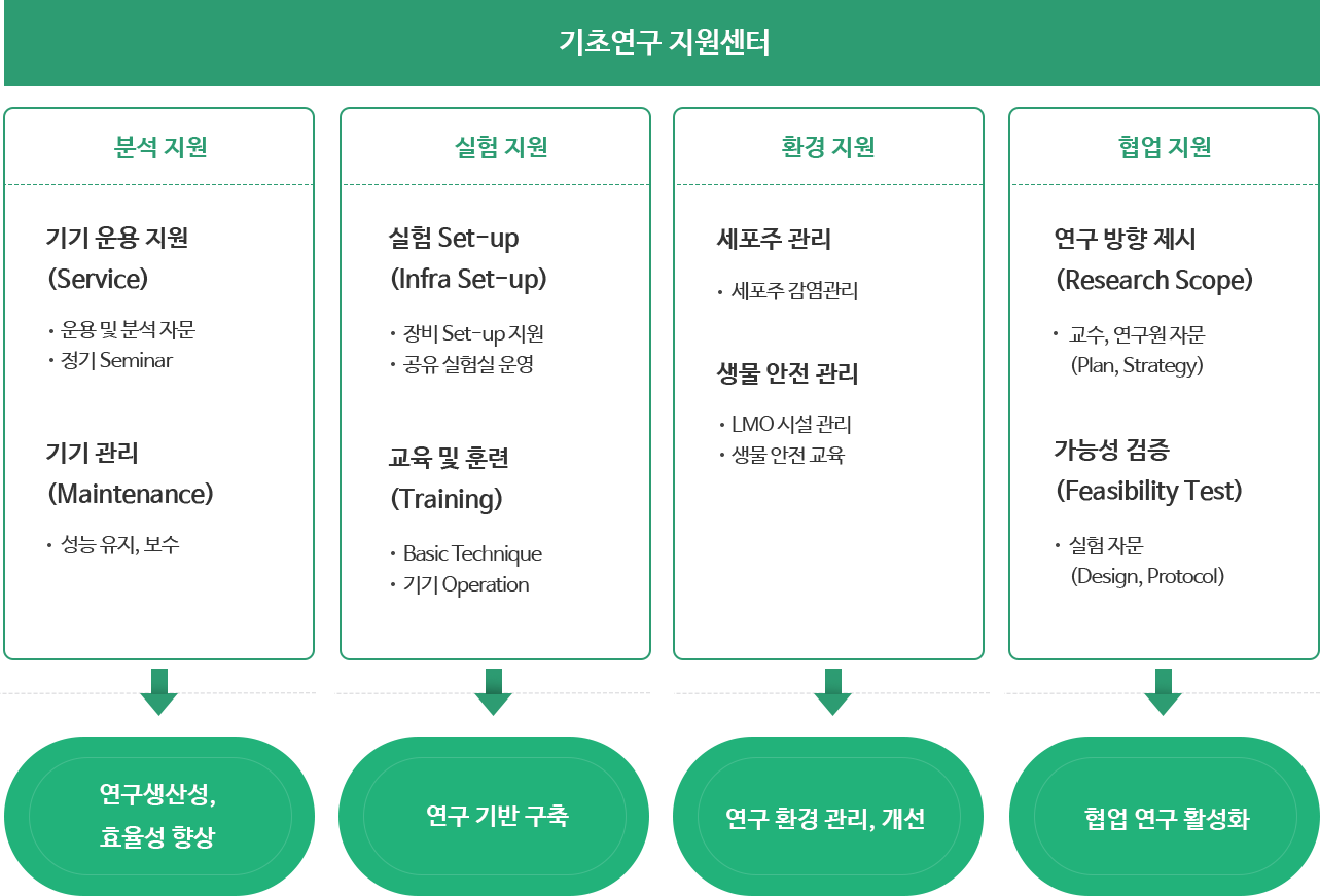 - 기초 탐색, 원천기술연구, 개발 후보 물질 연구 등을 위한 실험 장소 및 설비 제공