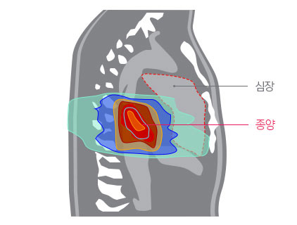 양성자치료의 장점은 심장 및 폐의 방사선량을 줄일 수 있다는 것입니다. 최근 식도암의 방사선치료에 있어 심장 부작용에 대한 관심이 커지고 있습니다. 방사선치료를 시행할 때 심장에 조사되는 방사선량이 많을 수록 수년 후에 심장 관련 부작용이 발생할 가능성이 커지게 됩니다. 양성자치료는 심장에 전달되는 방사선량을 최소화하여, 심장 부작용을 최소화 할 수 있다는 장점이 있습니다.